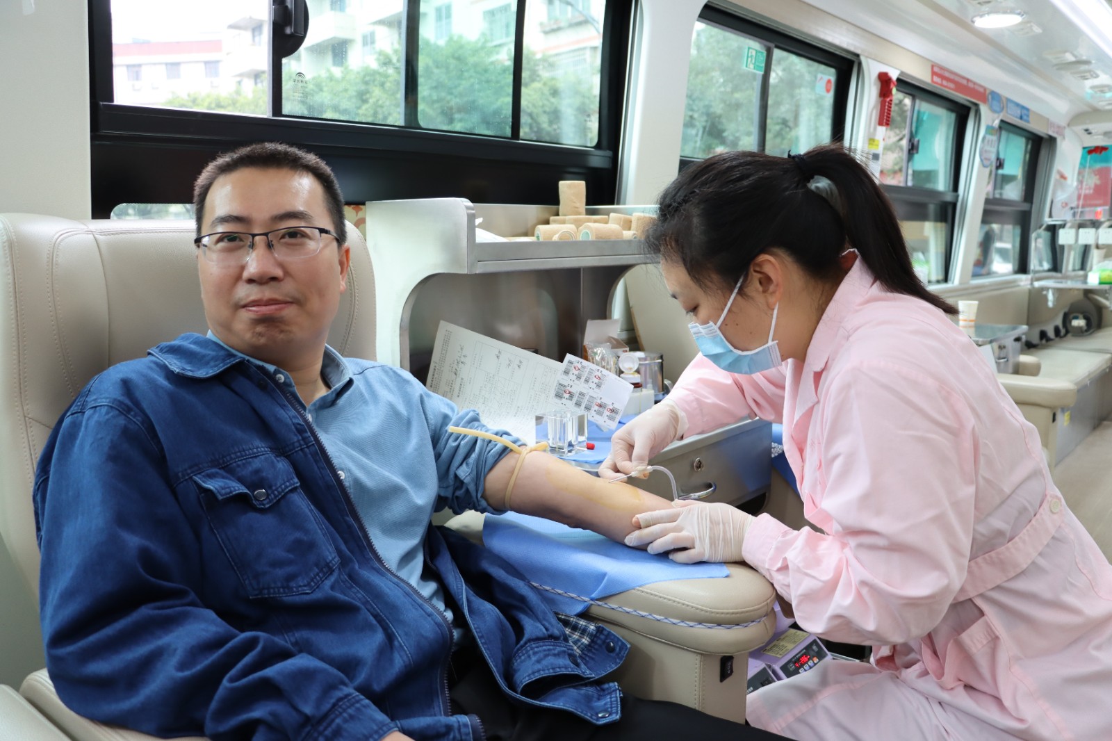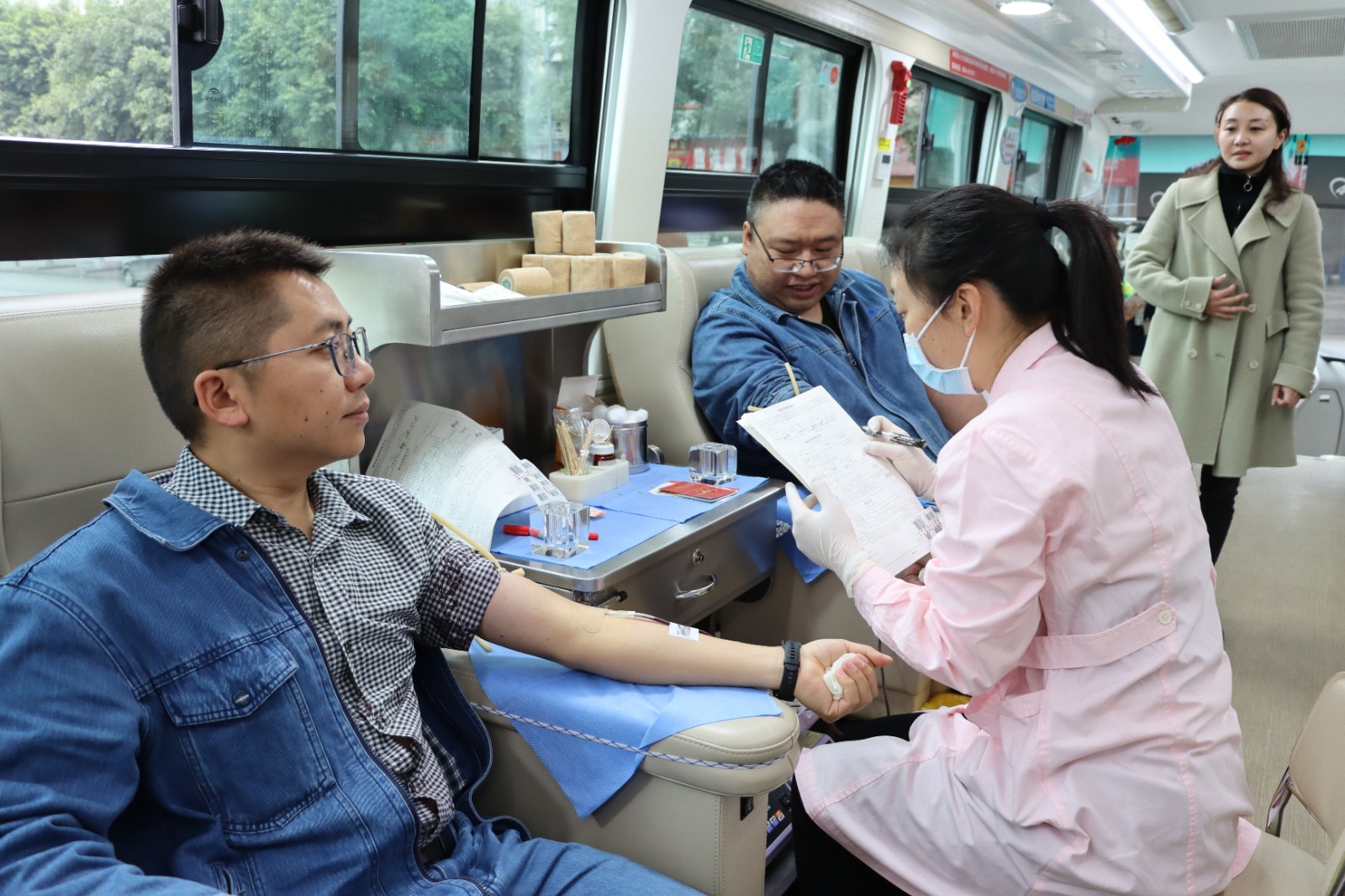 陽春三月,天氣雖然還有些寒冷,但春寒沒能阻擋天華人獻血的熱情。在醫(yī)務人員的引導下,來自集團職能部門和生產(chǎn)車間的職工列隊接受中心血站安排的獻血準備工作。參與獻血的志愿者有集團高層領導,也有中層管理人員和一線職工。大家認真填寫獻血登記表、測量血壓、配合抽血化驗等,在確定符合獻血條件后依次登上采血車接受采血。
